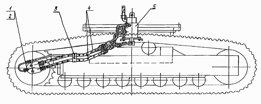 На рис. 3 показан удлиненный гусеничный ход с уширенными звеньями, позволяющий использовать экскаватор на слабых заболоченных грунтах.