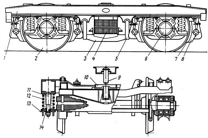 Рама кузова опирается на две ходовые части (тележки). Тележки