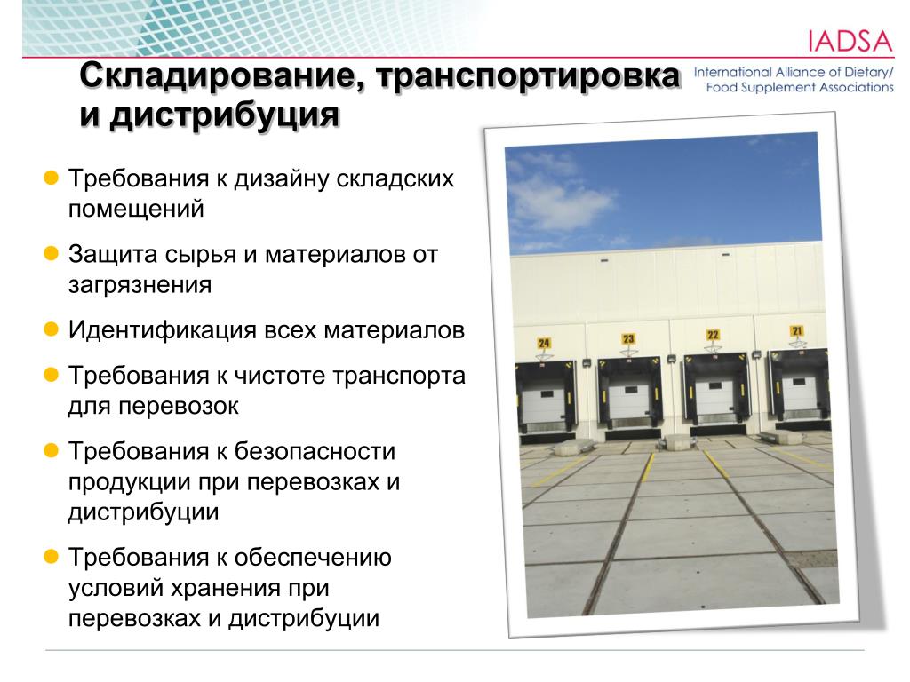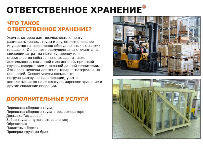 Мы можем: доставить грузы авиа-, ж/д-, авто-, морским транспортом из любой страны мира до собственного склада, оформить все сертификаты, таможенные и сопутствующие документы, произвести погрузо-разгрузочные работы на всех этапах транспортировки, выполнить маркировку, фасовку, упаковку товаров, организовать ответственное хранение по срокам годности, доставить в нужные сроки нужные объемы товаров материалов до дверей клиентов.