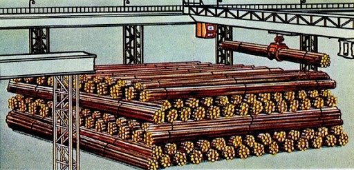 Объем пачек соответствует грузоподъемности применяемого оборудования. В плотные штабеля (рис. 2, в) лесоматериалы укладывают вплотную друг к другу, без прокладок при помощи кранов, оборудованных грейферами. Для предохранения от рассыпания концевые части штабелей должны быть выложены с учетом угла естественного рассыпания бревен, или по краям штабеля ряды бревен разделяют горизонтальными прокладками (рис.