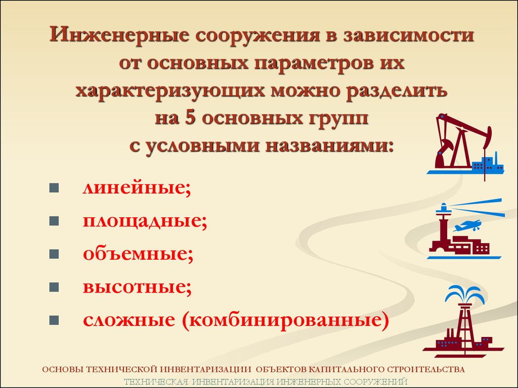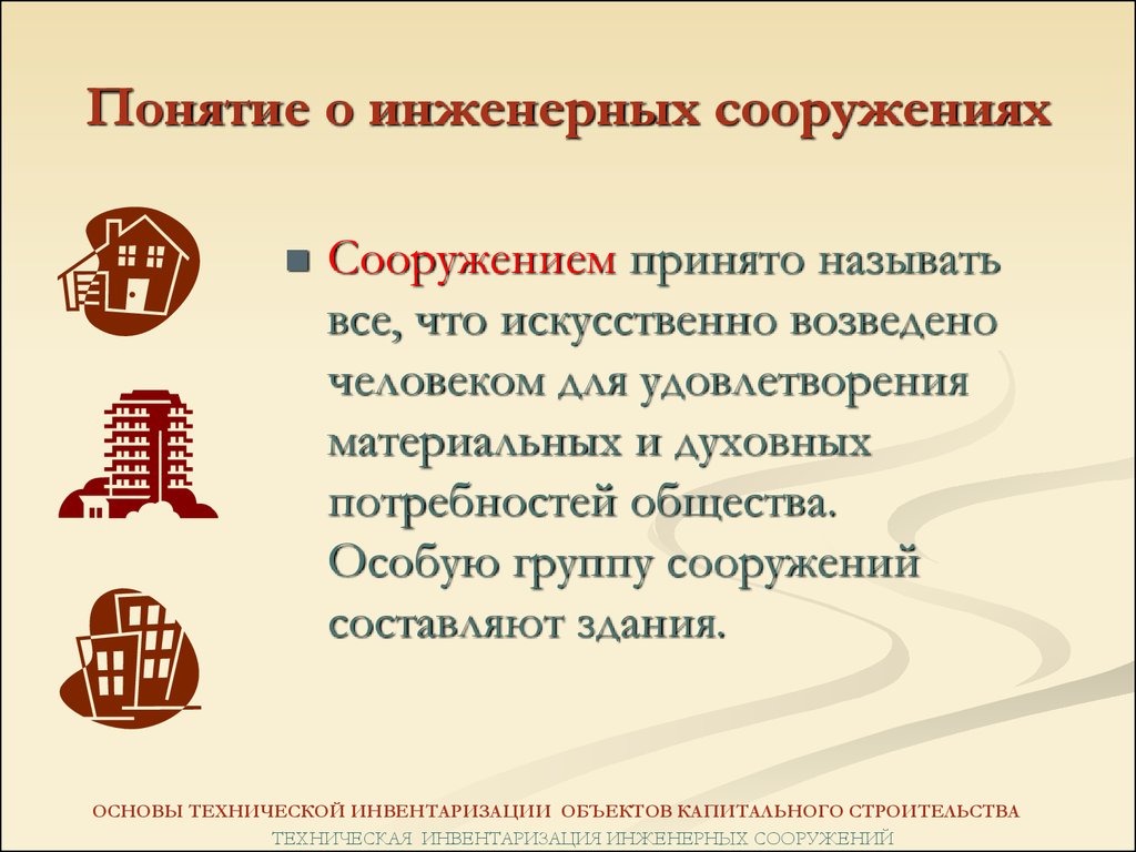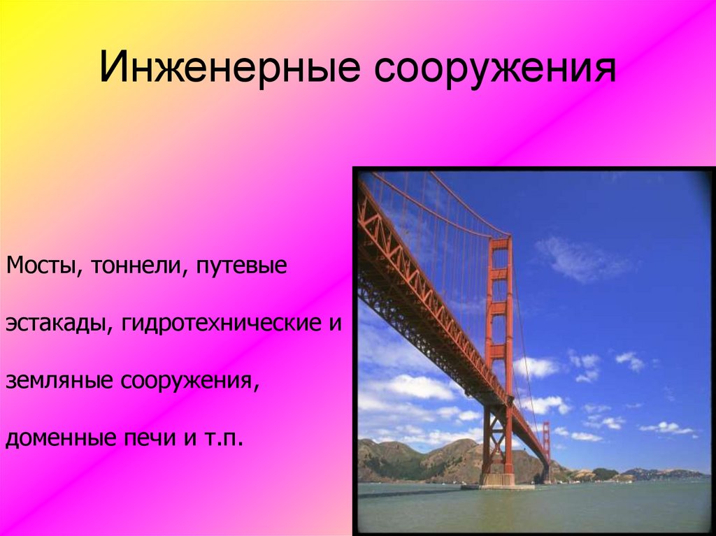 - «Инженерные сооружения – это объемные, пространственные или линейные надземные или подземные строительные системы, которые состоят из несущих, а в отдельных случаях, ограждающих конструкций, и предназначены для выполнения производственных процессов разных видов, размещения оборудования, материалов и изделий, для временного пребывания и передвижения людей, транспортных средств, грузов, перемещение жидких и газообразных продуктов и т.