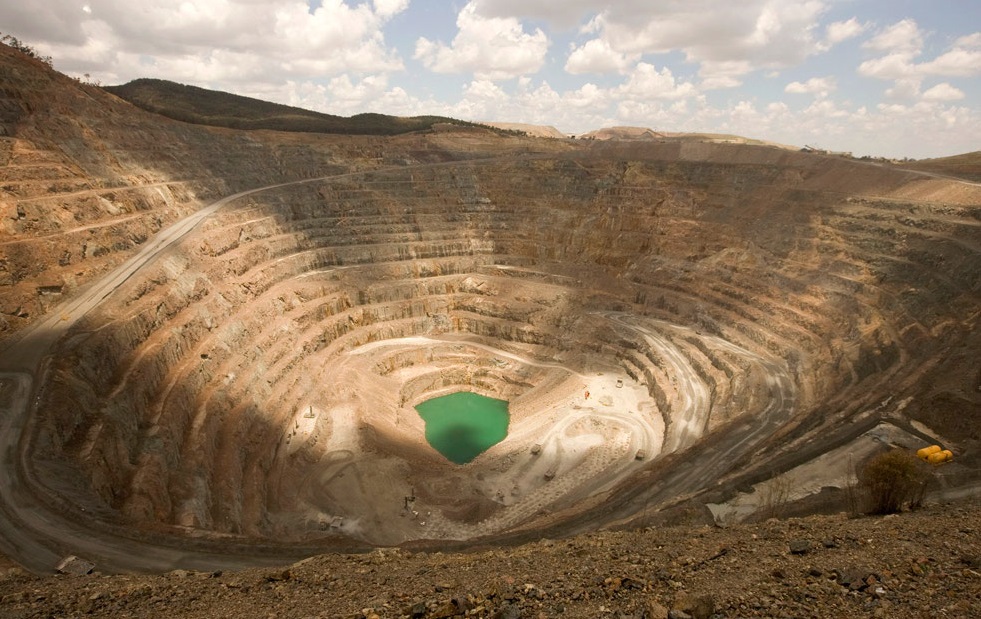 Эти шахты имеют коническую форму и используются для добычи близповерхностных рудных тел. Они имеют ряд уступов, спускающихся в карьер. Уступы используются в качестве рабочих площадок и подъездных дорог. Горная порода бурится, взрывается и загружается в большие самосвалы, которые доставляют ее на перерабатывающий завод.