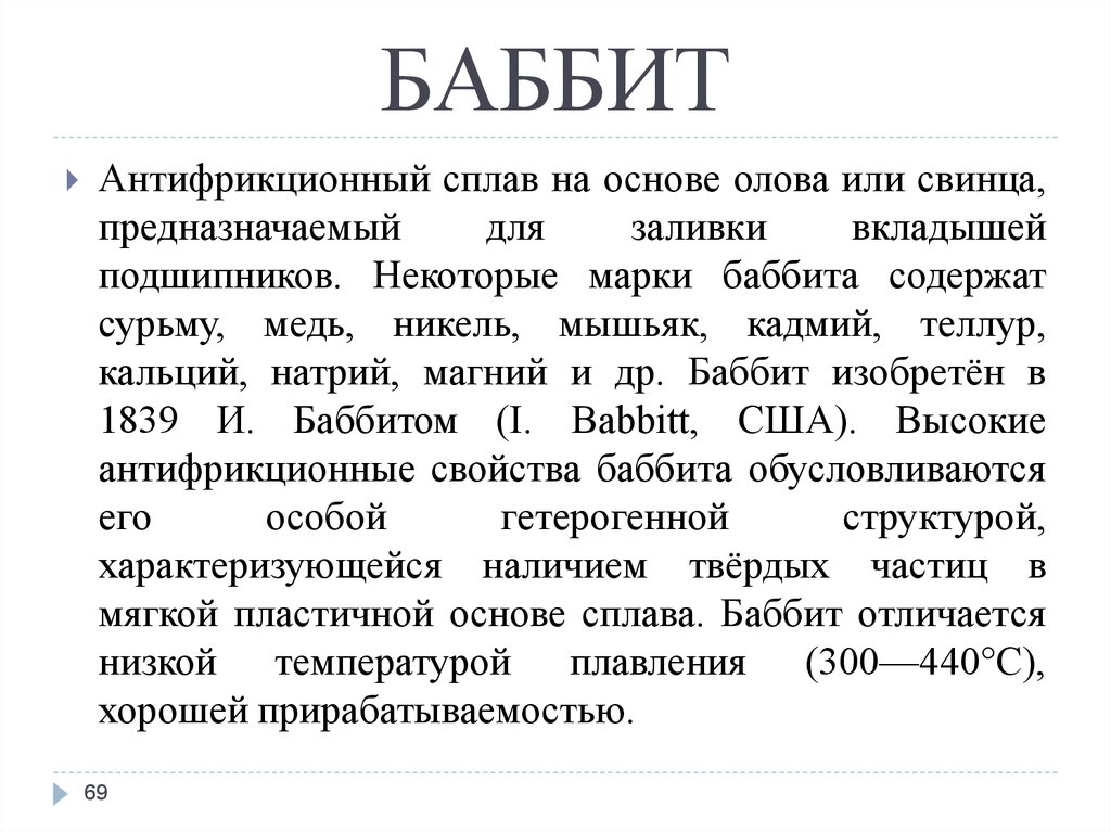 Баббитом называют сплав свинца с оловом. Этот материал ценится за его антифрикционные свойства. Трущиеся детали, покрытые этим материалом, имеют гораздо более продолжительный срок службы, чем детали из обычных сталей и сплавов. Применяют его, как правило, для заливки подшипников трения.