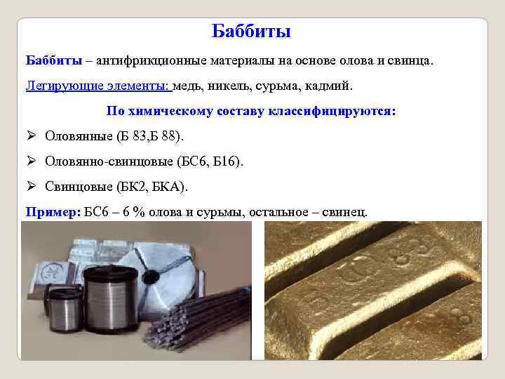 Под понятием баббитов собраны различные по химическому составу сплавы, играющие роль антифрикционных материалов. Классификация их основана на виде главного элемента.