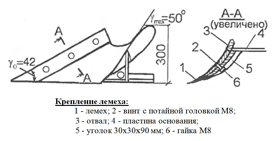 Главный рабочий элемент плуга — это лемех (нож). На лемех приходится основная нагрузка при вспашке, потому что именно этот элемент прорезает слой земли. Со временем лемех затупляется, что приводит к уменьшению производительности пахоты. На агрегате должен быть установлен съемный лемех.