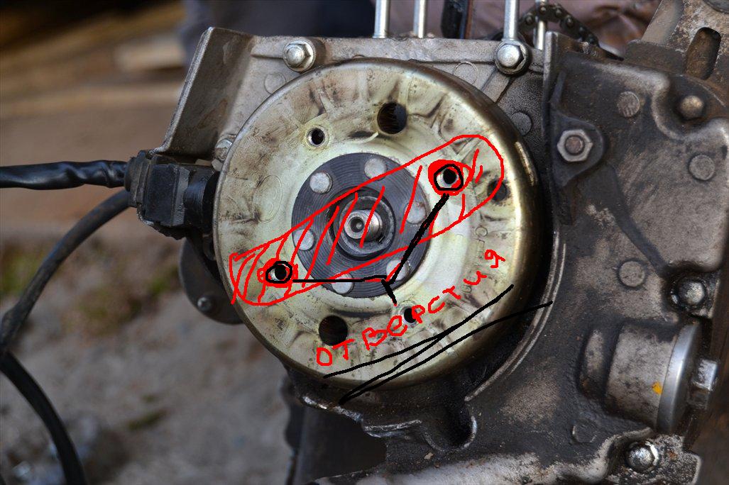 Такая регулировка зажигания проходит подобно, но с предварительным снятием системы декомпрессии.