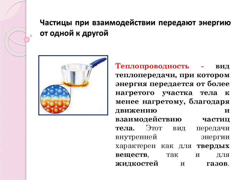 Внутренняя энергия, как и всякий, иной вид энергии, может передаваться от одного тела к другому. Мы уже рассмотрели один из примеров такой передачи — передачу энергии от горячей воды к холодной ложке. Такой вид теплопередачи называется: теплопроводностью.