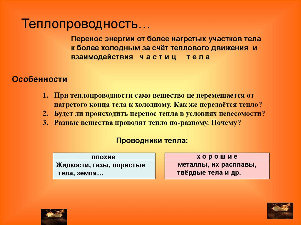 е. повышается температура следующей части проволоки. Затем увеличивается скорость колебания следующих частиц и т. д. При этом очень важно заметить, что при теплопроводности само вещество не перемещается от одного конца тела к другому.