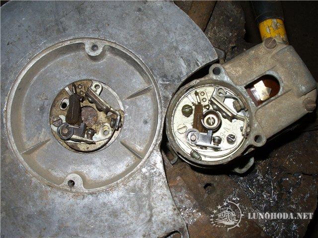 Сняв верхнюю часть корпуса магнето (слева), можно увидеть блок распределителя (круглый, черный) и ведущую шестерню.