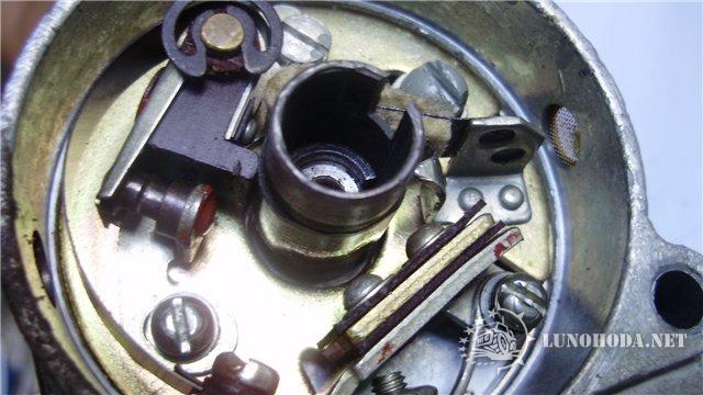 При снятом блоке распределителя (справа) хорошо видны катушка и точки. Катушка должна быть расположена так, чтобы она была наверху.