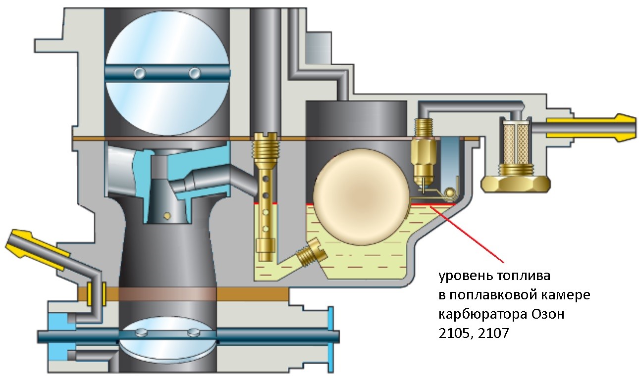 - Поплавок в камере всплывает в тот момент, когда бензин доходит до определённого уровня. Он давит на иглу, которая закрывает доступ горючего.