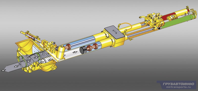 - Когда поршень доходит до задней крайней точки шибер связывающий цилиндр с бункером закрывается, открывается другой, который перекрывал до этого выход в бетонопровод.