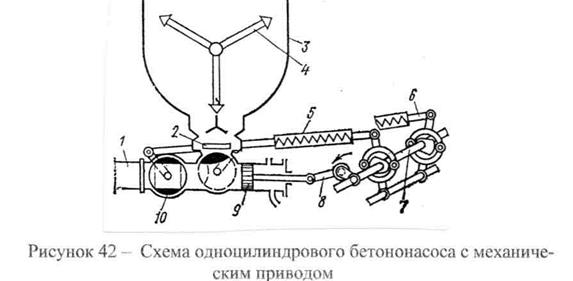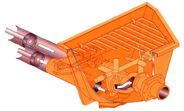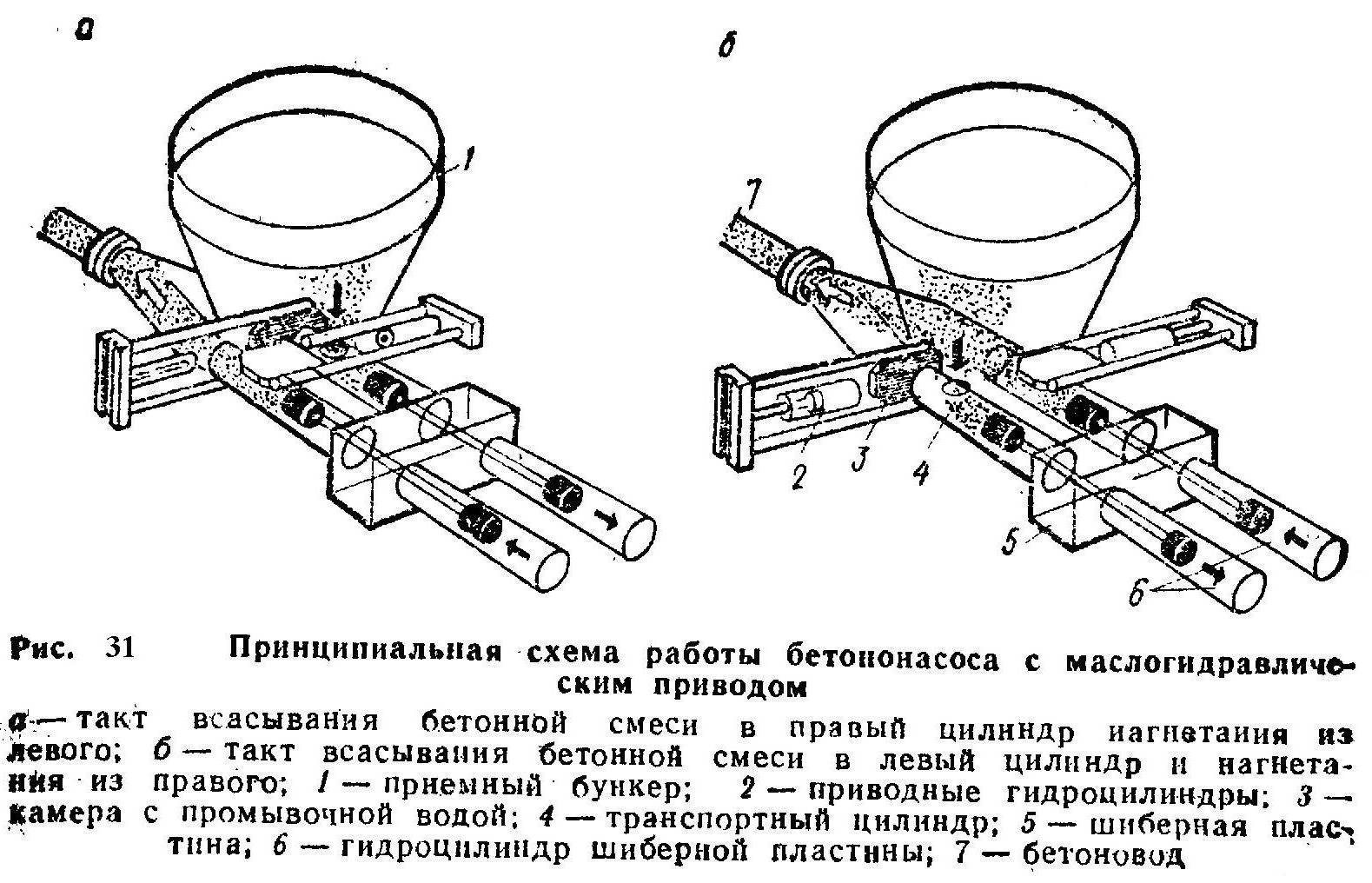 - При прямом ходе поршня порция смеси выталкивается в бетонопровод.