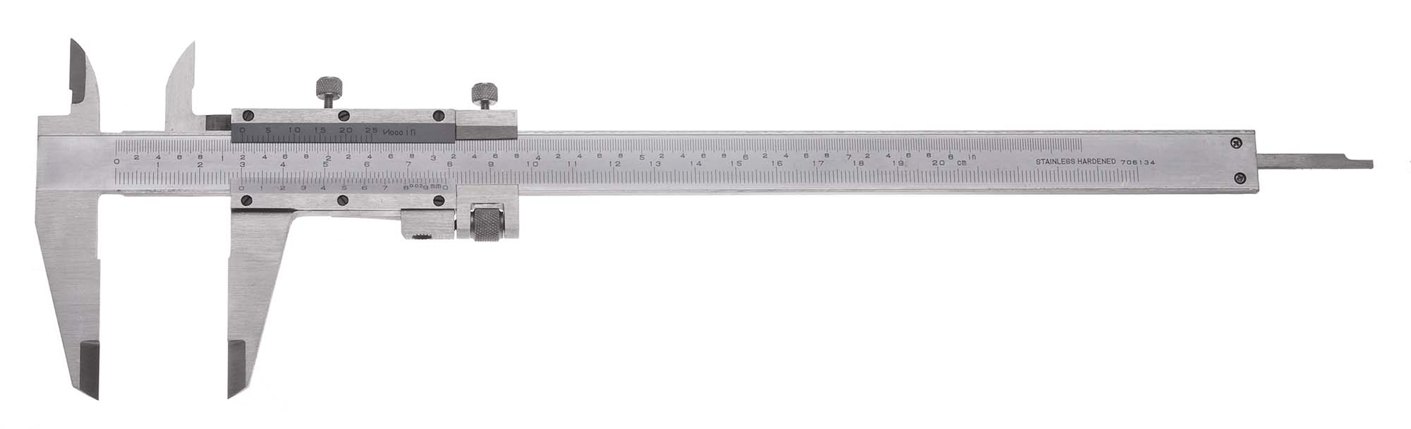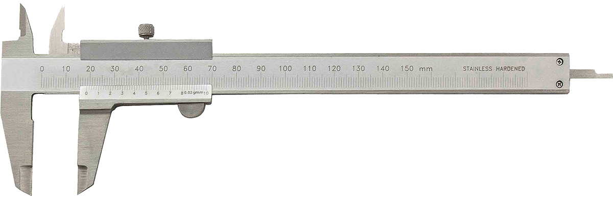 Штангенциркуль позволяет отсчитывать диаметр непосредственно и с высокой точностью. Неподвижная основная шкала британского штангенциркуля имеет 50 делений на дюйм, а подвижная шкала нониуса – всего 20 делений. Сумма этих 20 делений равна сумме 19 делений основной шкалы. Поэтому, когда нулевой штрих шкалы нониуса останавливается между двумя штрихами основной шкалы, только один штрих шкалы нониуса может лежать точно напротив какого-либо штриха основной шкалы.