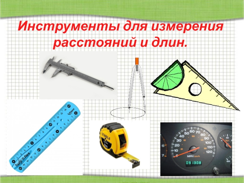Инструменты для измерения длины включают в себя линейки, рулетки и микрометрические винтовые калибры, но наиболее точным инструментом является штангенциркуль .