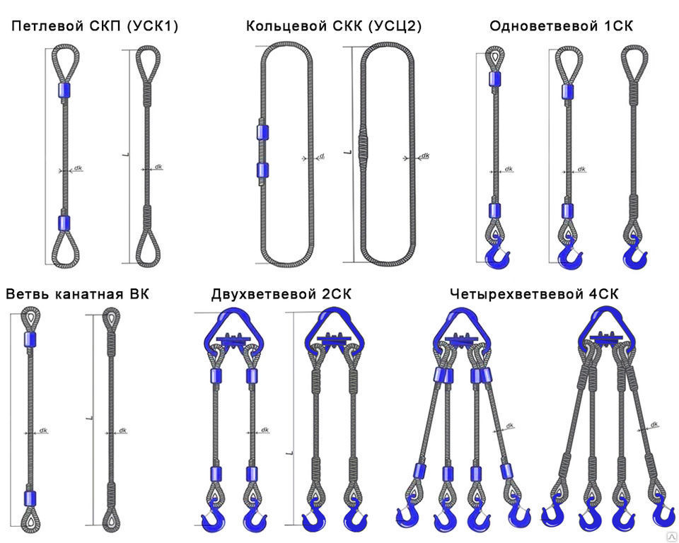 Стальные канаты с линейным касанием бывают четырех видов в зависимости от диаметра проволок: ЛК-О, ЛК-Р, ЛК-РО, ЛК-3; канаты с точечным и линейным касанием — трех видов: ТЛК-О, ТКЛ-Р, ТЛК-РО.