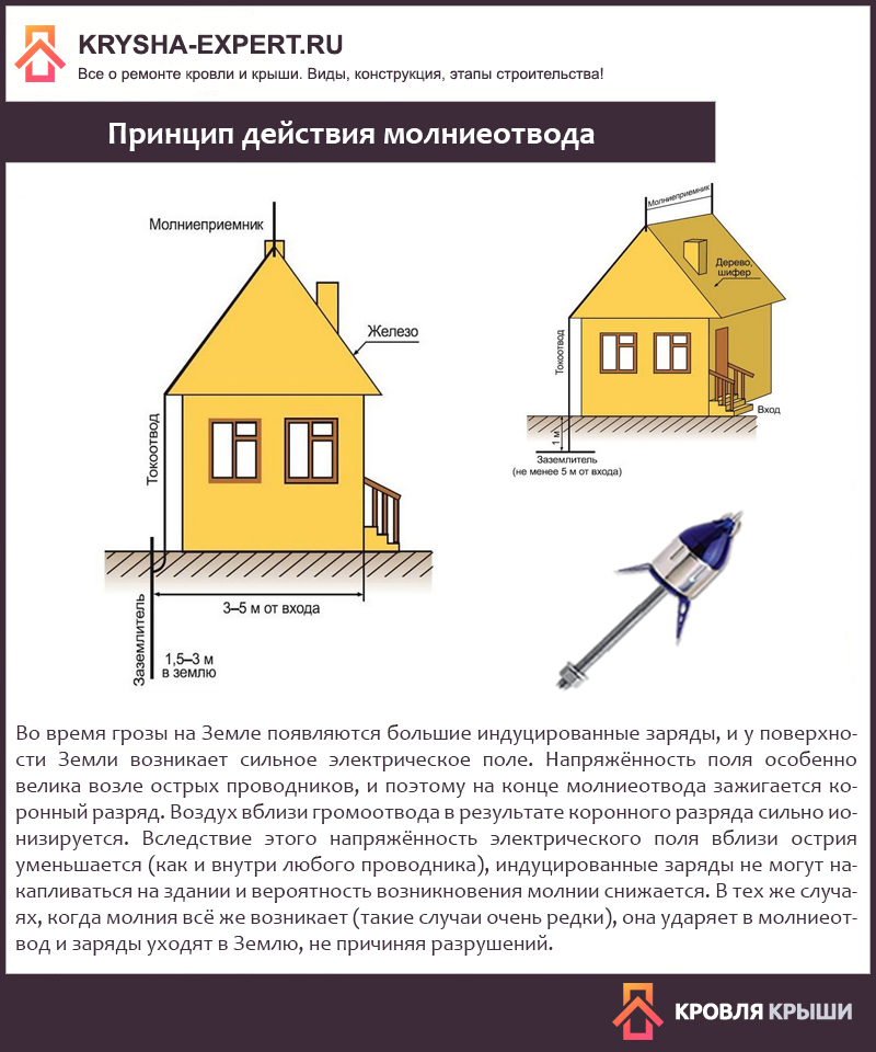 Система молниезащиты жилого дома состоит из тех же материалов и монтируется так же, как и в большом здании. Тем не менее, в большом здании может быть несколько стержней и несколько проводников, идущих к земле.