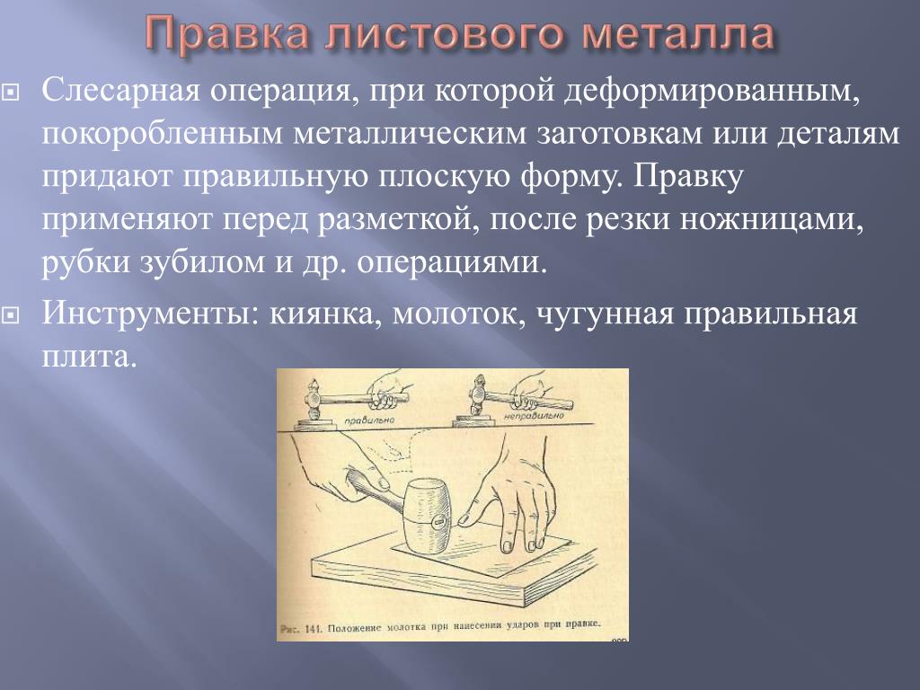 Правка — это выправление металла действием давления на какую-либо его часть независимо от того, производится это давление прессом или ударами молотка.