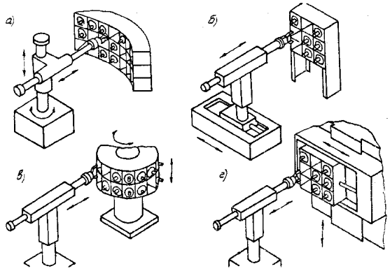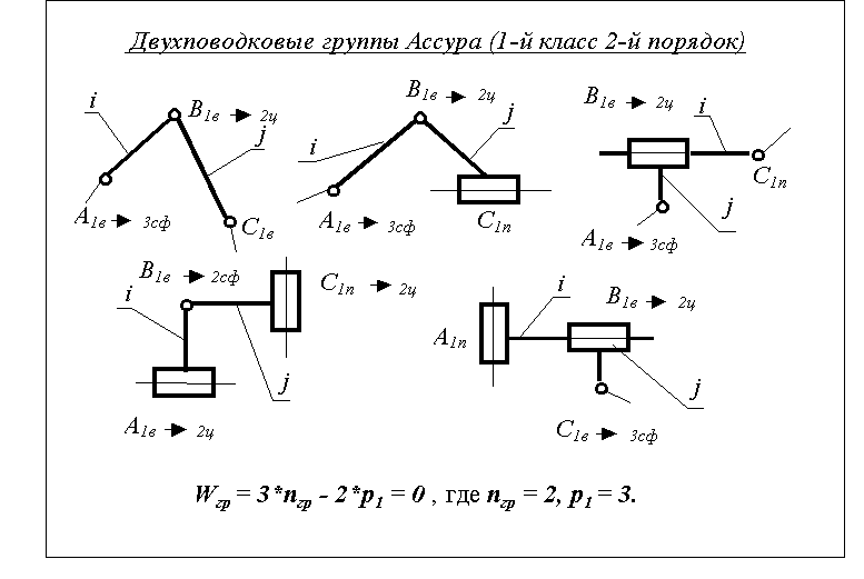 Во второй группе кинематических схем используется произвольное расположение звеньев и кинематических пар, при этом движение, например в плоскости, может быть организовано использованием совместной работы не менее трех кинематических пар. При этом законы движения звеньев (даже при простых законах движения рабочего органа) оказываются очень сложными, поэтому эта группа кинематических схем получила наименьшее распространение.