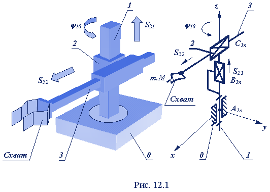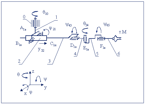 На рис. 1 изображена кинематическая схема манипулятора, движение в базовой плоскости которого обеспечивается двумя шарнирно-сочлененными звеньями, плечом и предплечьем. Выполняя, например, вращение схемы вокруг оси Y, получим круговой обслуживаемый объем. Если же кинематической схеме обеспечено продольное движение вдоль оси Z, то получим обслуживаемый объем в виде параллелепипеда при обслуживаемой зоне прямоугольной формы, характерной для погрузочных манипуляторов. Схема манипулятора является антропоморфной и ее преимущественное применение объясняется традицией и рядом конструктивных достоинств.