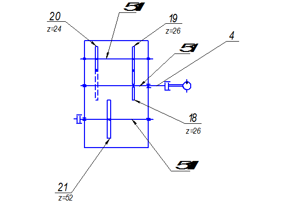 Коробка перемены передач представляет собой двухступенчатый редуктор, передаточное число которого может изменяться водителем для изменения тягового усилия в соответствии с условиями движения. Очевидно, наибольшее тяговое усилие должно быть при движении нагруженного погрузчика на подъеме, при этом передаточное число коробки передач устанавливается максимальным. Основные части коробки перемены передач: ведущий вал, ведомый вал и промежуточный вал (с ним связаны зубчатые колеса 2, 3, 4, 6, имеющие различные диаметры).