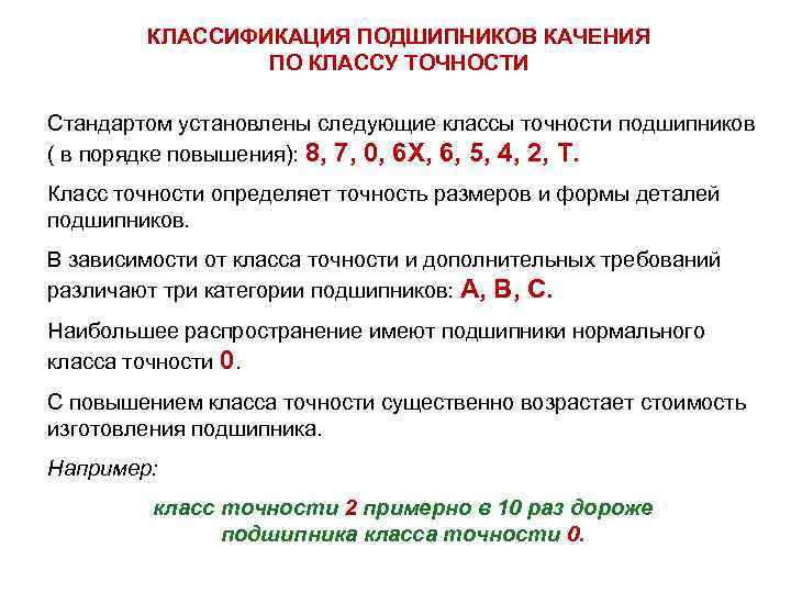 По ГОСТ установлены следующие классы точности подшипников: 8, 7, 0 — (нормальный), 6, 5, 4, Т, 2. Эти классы классифицируют шариковые, роликово-радиальные и шариковые радиально-упорные подшипники;