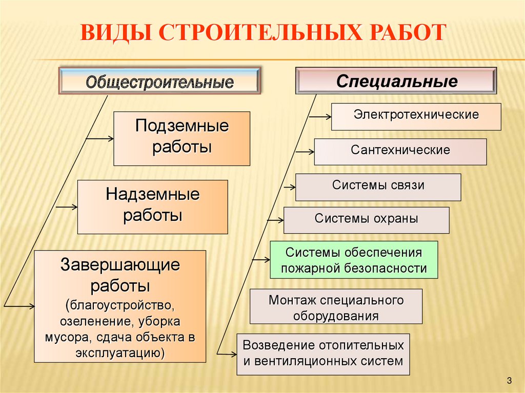 Все они имеют ряд особенностей, позволяющих классифицировать виды работ по характеру их структуры и правилам, регулирующим отрасль.