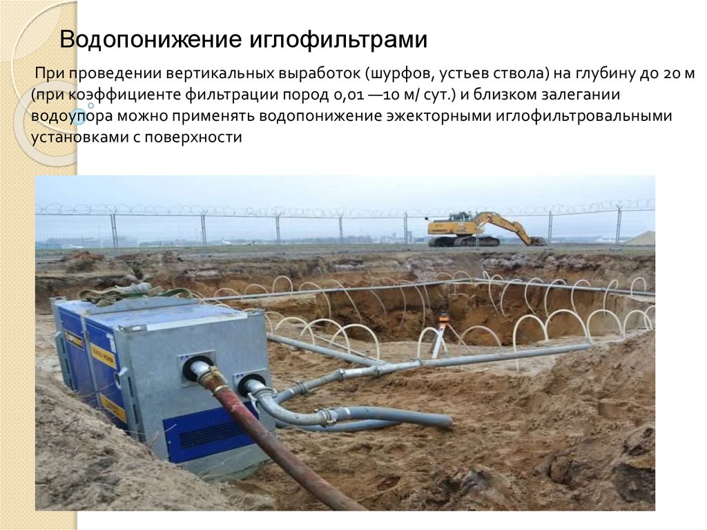 Метод эжекторного обезвоживания включает в себя серию скважин малого диаметра, оборудованных насадкой Вентури (корпус эжектора), которая приводится в действие насосной станцией на уровне земли.