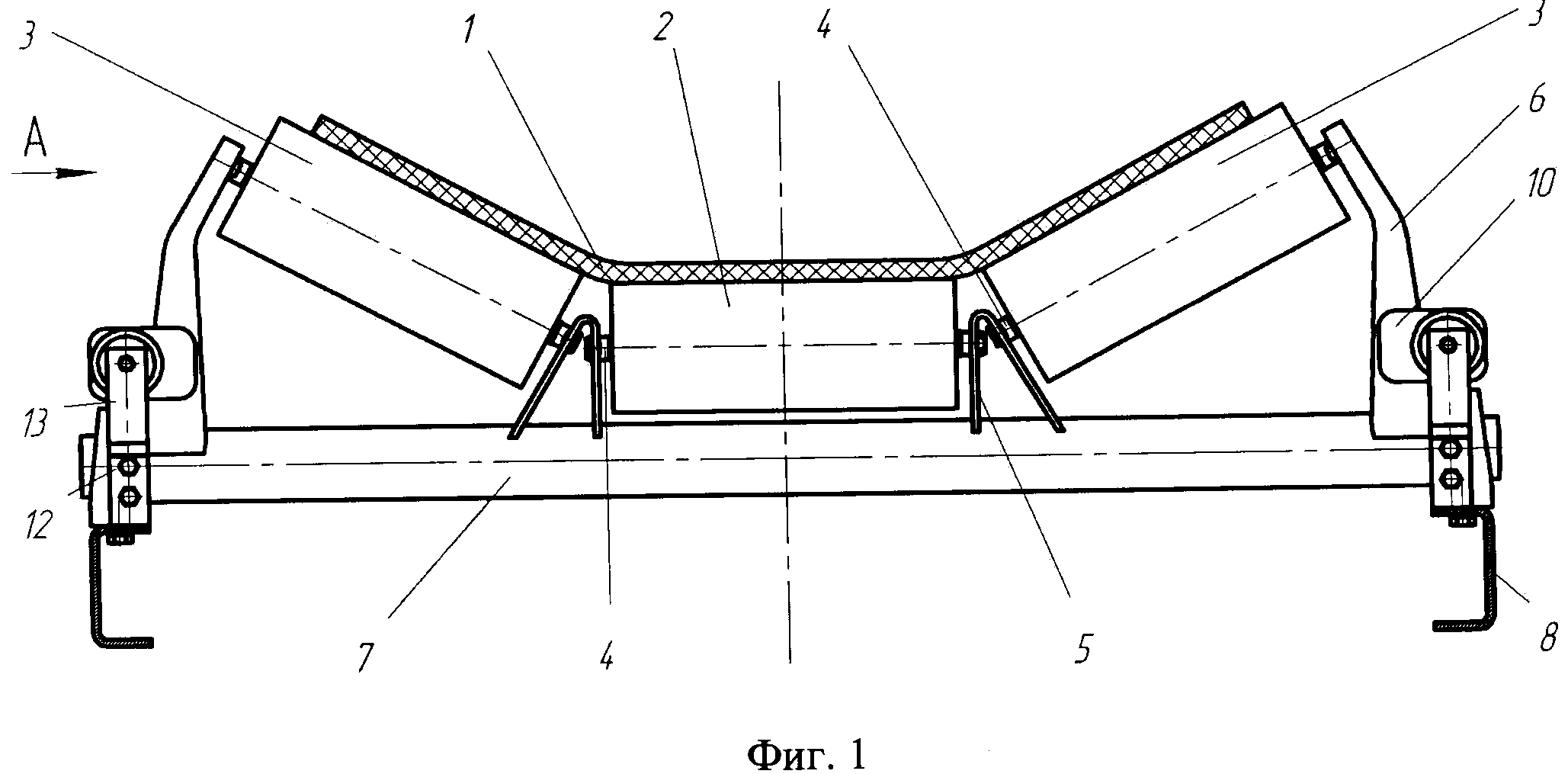 Выравнивающие, или центрирующие ролики служат для защиты ленты от схода. Представляет собой обычную прямую или желобчатую роликоопору с перпендикулярно установленным к ее оси дефлекторным роликом.