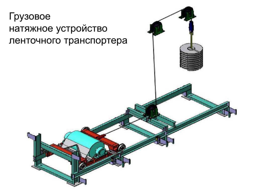 - При помощи натяжного барабана лента удерживается в заданных конструкцией рамках и плавно скользит по роликовым опорам.