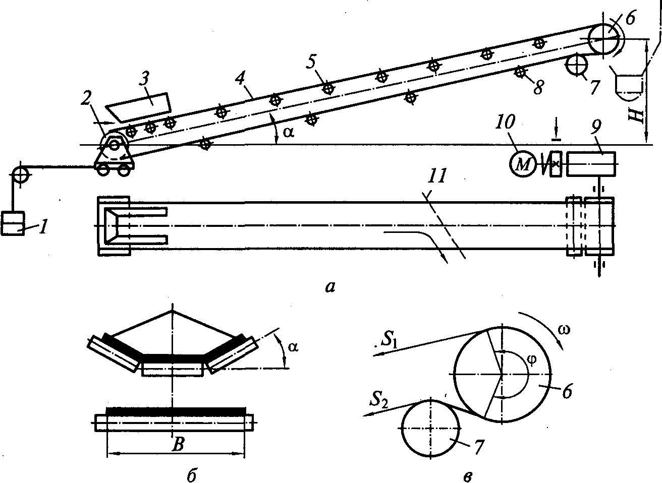 По всей длине рамы в определенном порядке расположены роликовые опоры. В крайних (торцевых) точках рамы устанавливаются приводной и натяжной барабаны. Приводной барабан оснащается специальным валом, через который он присоединяется к редуктору и далее к двигателю. Лента располагается поверх роликовых опор, натяжного и приводного барабанов.