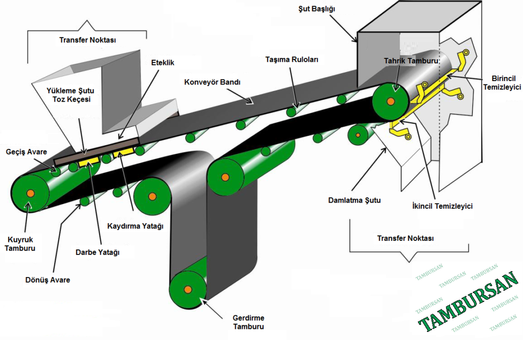 Вдоль става конвейера располагаются роликоопоры, непосредственно по которым и перемещается лента. Натяжение ленты осуществляется с помощью натяжного устройства. Под конвейером располагаются поддерживающие ролики, а от схода ленты устанавливают вертикальные центрирующие (дефлекторные) ролики. При эксплуатации конвейера возможно налипание транспортирующего материала, для очистки ленты и барабана используются скребковые устройства.