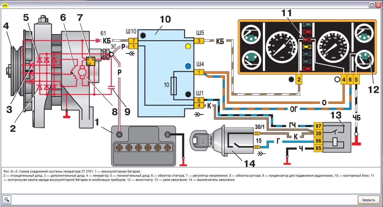 регулятор, клемма “67” генератора, обмотка возбуждения, (ротор) генератора, заземление блока и “-” батареи.