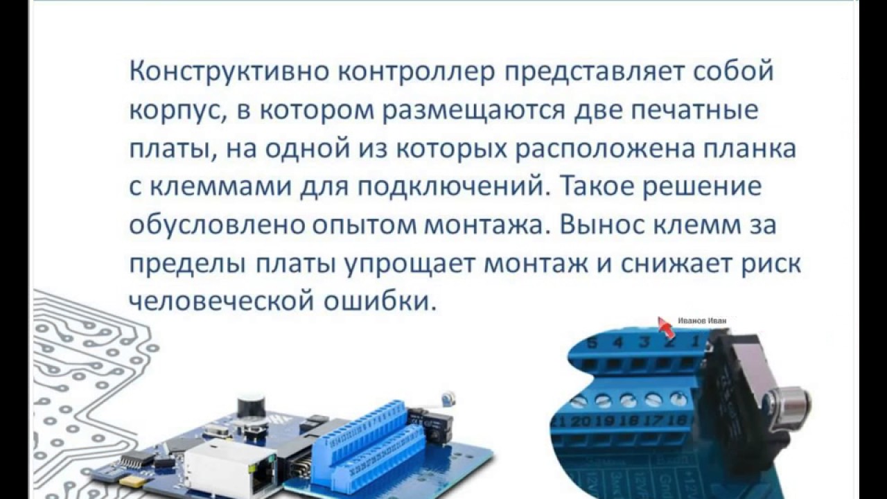 Например, интерфейс USB позволяет менять прошивку контроллера. Сетевой Ethernet позволяет подключить устройство к сети Интернет и мобильному приложению.