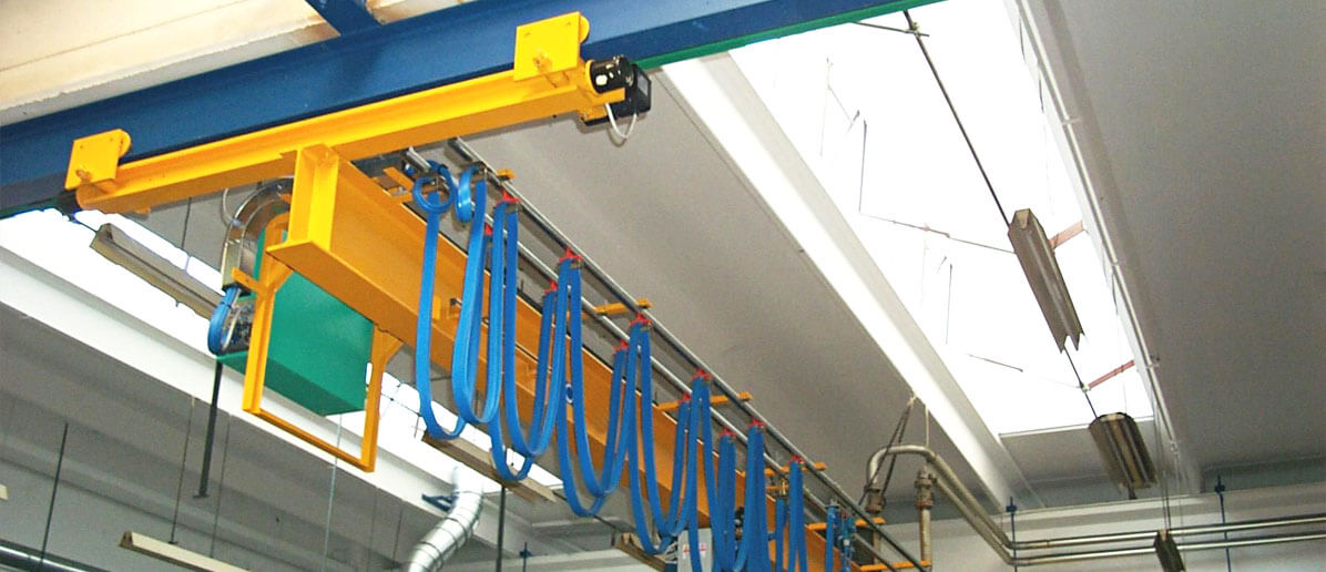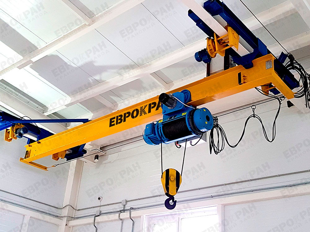 Подвесная кран-балка располагается ниже крановых путей, для установки которых не требуются специальные опоры. Такой кран можно монтировать непосредственно на несущие конструкции помещения. Этот вариант оптимален, когда не требуется работа крана в тяжелых режимах или перемещение тяжелых грузов.