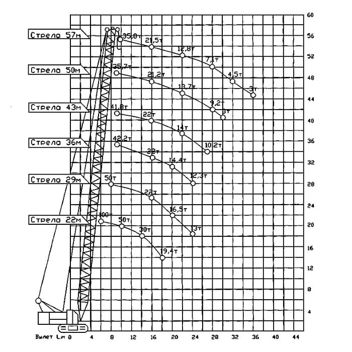 Стрела секционная может быть длиной 22, 29, 36, 43, 50, 57 метров. Максимальный вылет стрелы от оси крана составляет 44 метра.
