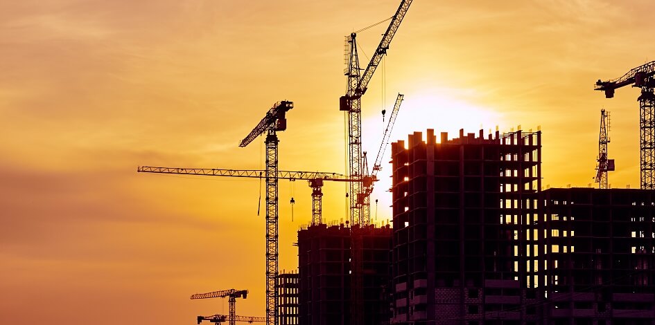 Горизонтальная иллюстрация строительной площадки с кранами и небоскребами на закате в оранжевых тонах.