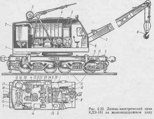 Кран КДЭ-163 (фиг. 40) состоит из самоходной четырехосной платформы, поворотной рамы, дизель-генераторной установки, рабочих механизмов, кузова, кабины управления, стрелы и грузозахватных устройств.