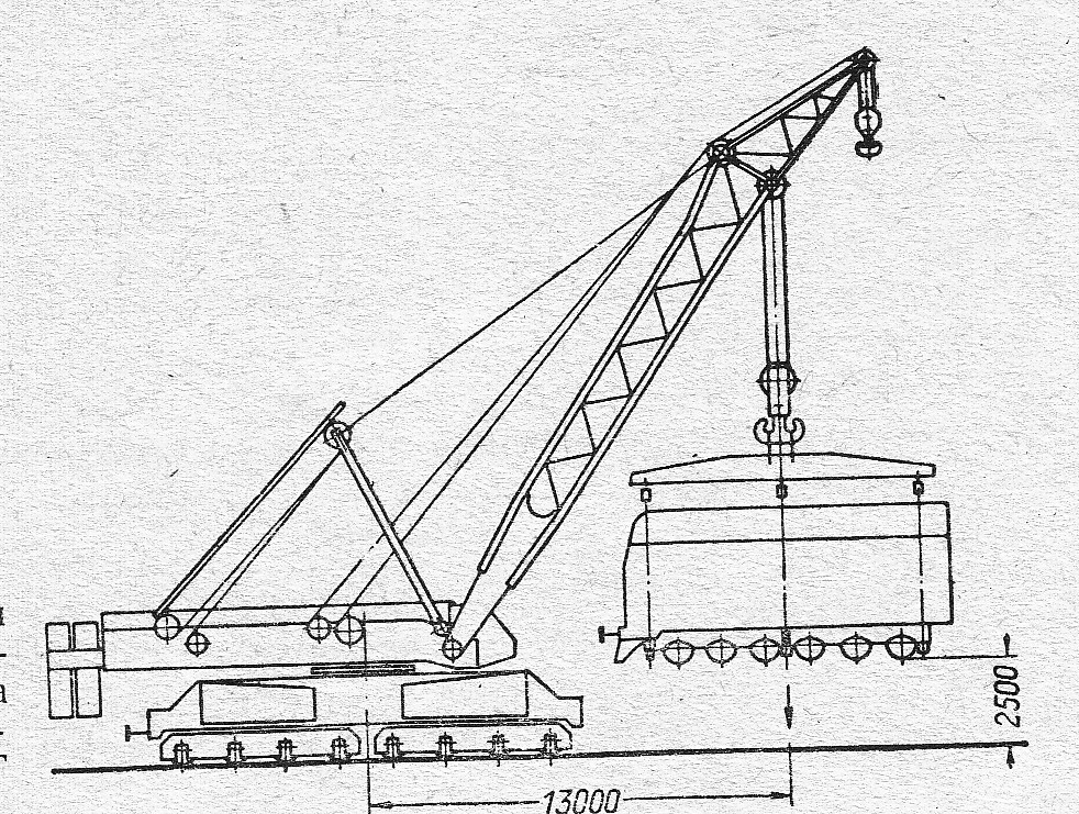 Сейчас для демонтажа старых опор контактной электросети и монтажа новых используются стреловые краны на железнодорожном ходу, например типа КДЭ-161, КДЭ-163, КДЭ-253, содержащие платформу на ходовых тележках, на которой смонтированы дизель-электрический агрегат и опорно-поворотное устройство, на котором закреплена вращающаяся часть с поворотной стрелой и крюковой обоймой (см. кн. В.А. Степанов и Г.И.Мелихов “Промышленный железнодорожный транспорт строительных предприятий и организаций”, практическое пособие, М., Стройиздат, 1978 г., стр.49-50 и стр.