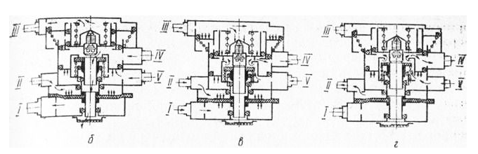 При этом выход IV соединяет магистраль управления тормозами прицепа с атмосферным выходом VI через разгрузочные отверстия 3 клапана и штока.