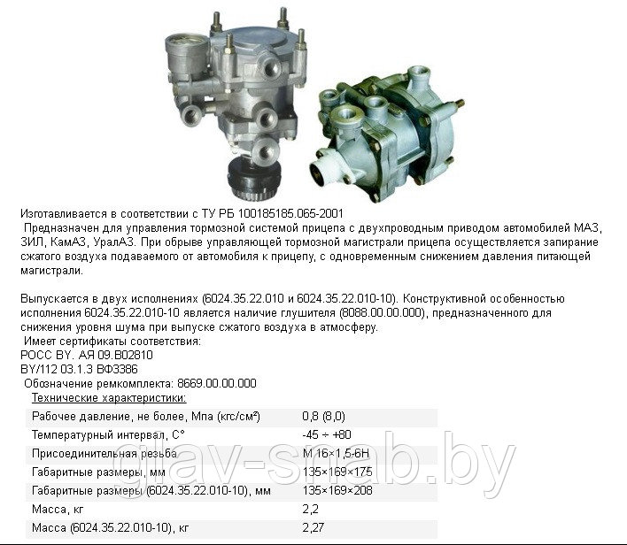 Кроме того, он препятствует утечке сжатого воздуха из системы при аварийном снижении давления в приводе автомобиля, что позволяет предотвратить самовольное торможение прицепного устройства.