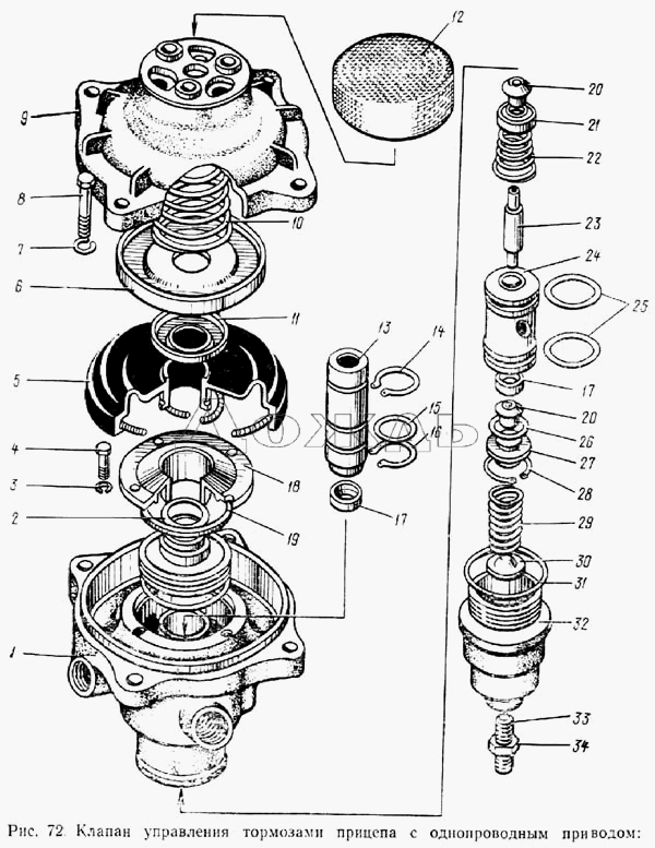 Давление в магистрали управления тормозами прицепа увеличивается до тех пор, пока сила, действующая на поршень 12 снизу, не уравновешивается силой, действующей на мембрану 1 и поршень 12 сверху, что обеспечивает догоняющее действие клапана 4.