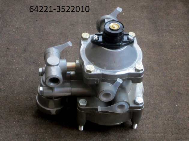 Клапан отвечает за управление тормозами полуприцепа, направляет сжатый воздух от входного источника к последующим потребителям, работающим как синхронно, так и порознь. К двум выводам подается команда на увеличение давления в магистрали, а на один аналог поступает обратное действие, влияющее на понижение давления при выпуске воздушной смеси посредством ручного рычага.
