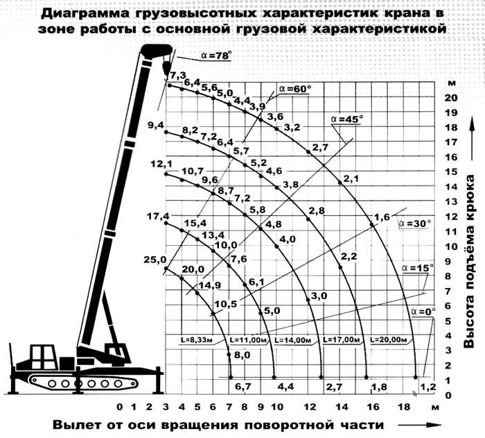 Основная стрела крана длиной 10 м состоит из двух секций, выполненных из уголков. За счет сменных секций стрела может быть удлинена до 14 и 18 м. На стрелу 18 м предусматривается установка гуська длиной 3 м.