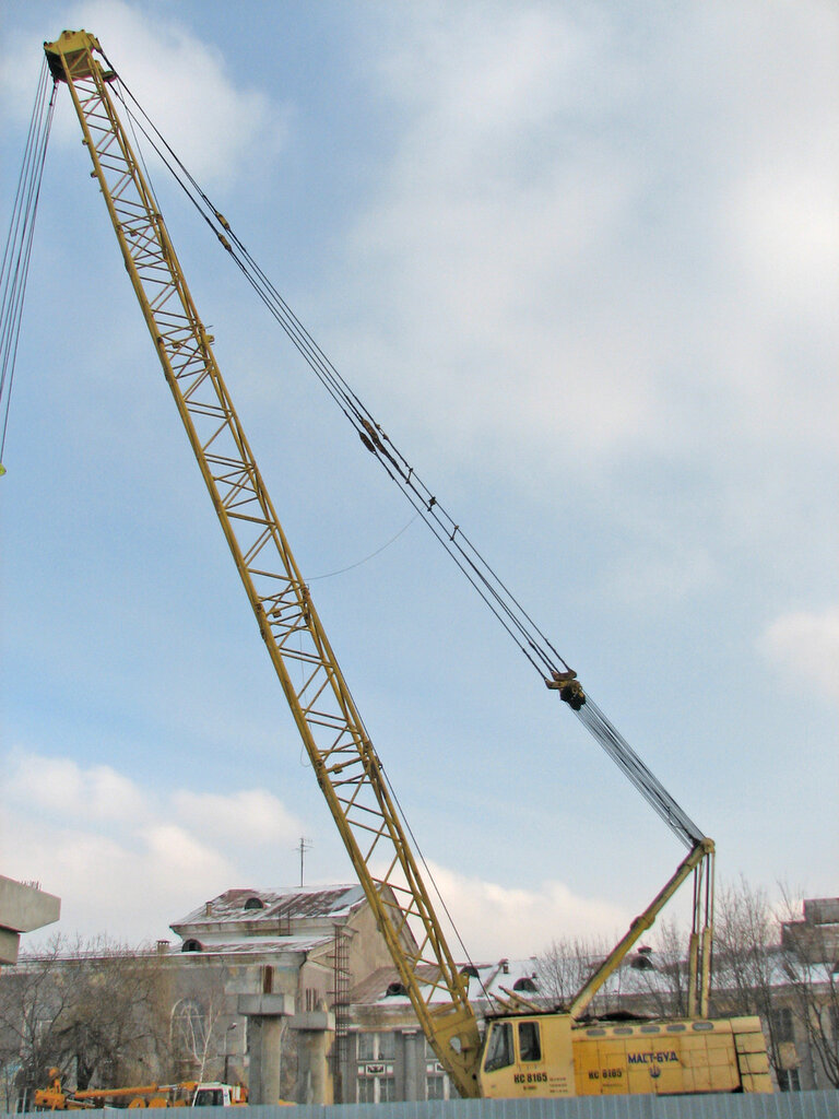 При строительстве объектов из крупных железобетонных конструкций нужна мощная подъемная техника. Для этого не всегда подходит башенный кран, особенно в случае проведения работ в условиях неровной местности, бездорожья, где установить последний затруднительно. Самоходный кран кс-8165 на гусеницах как раз относится к категории оборудования, которое может работать в самых сложных условиях. При этом он отличается большой устойчивостью и грузоподъемностью.