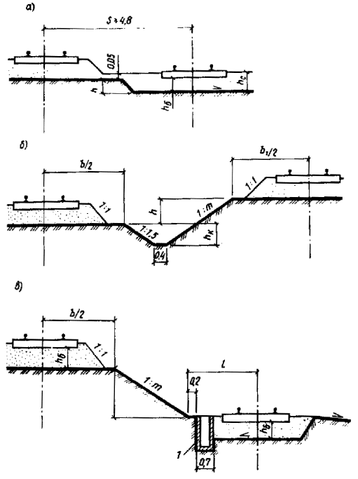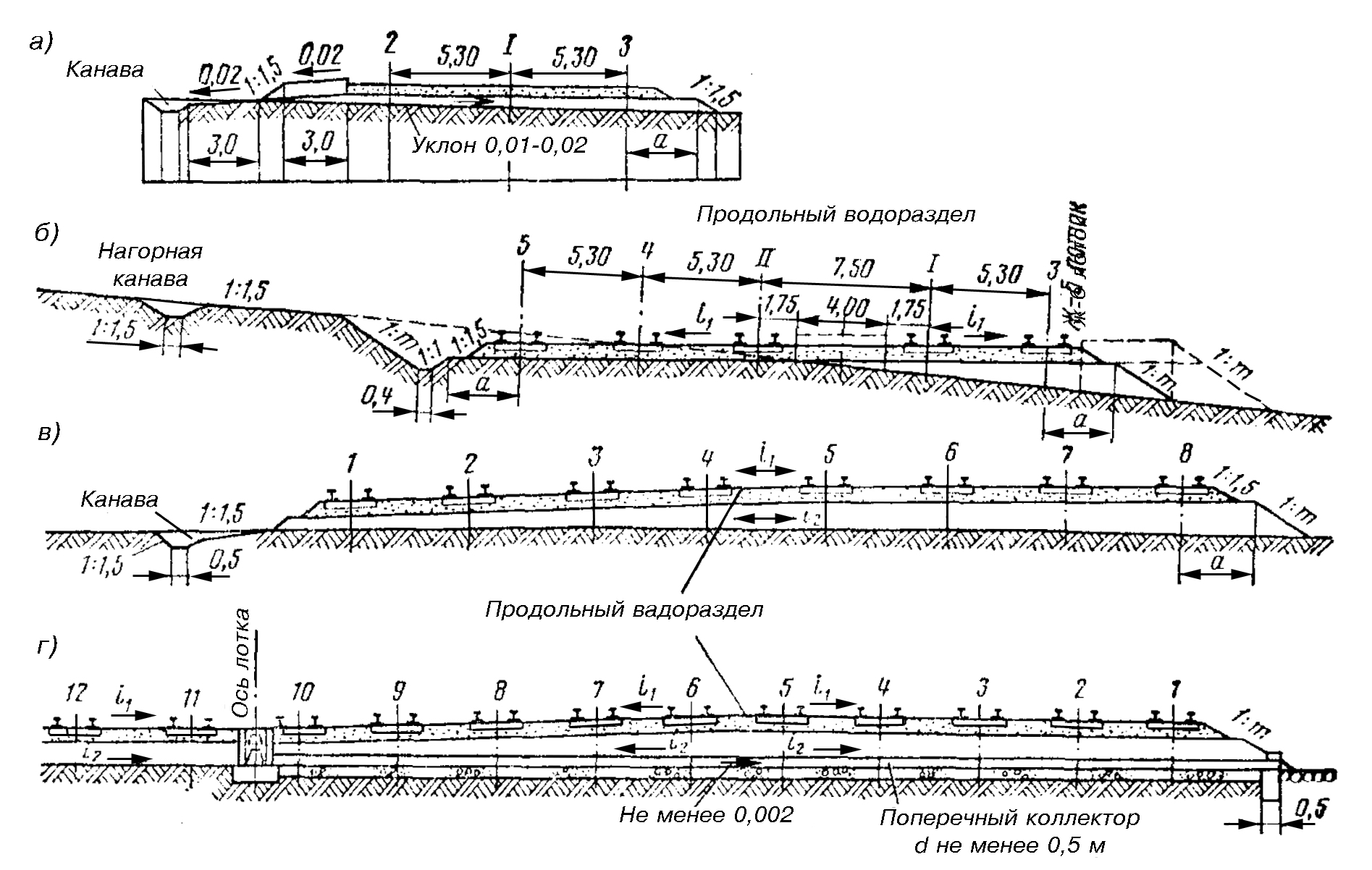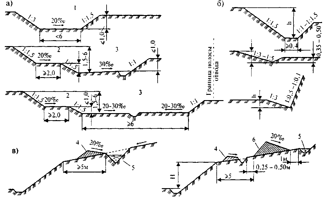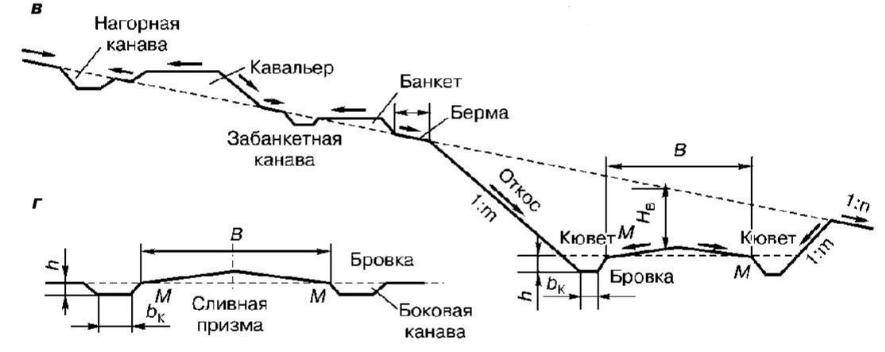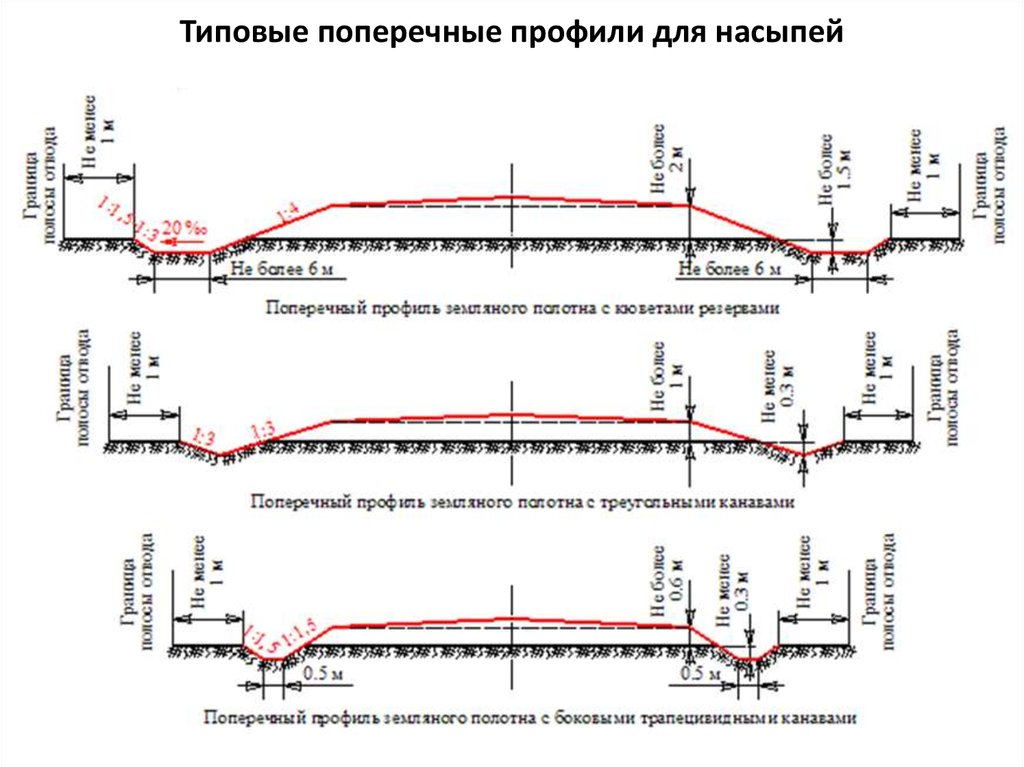 - Чтобы дать возможность машинам съезжать с трассы, водоотводные каналы в зависимости от водопроницаемости почвы проектируются в виде различных геометрических фигур. Например: