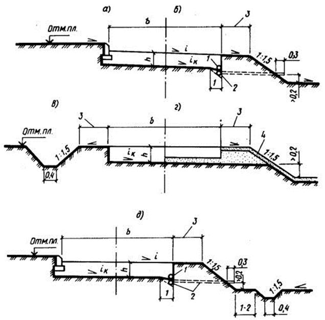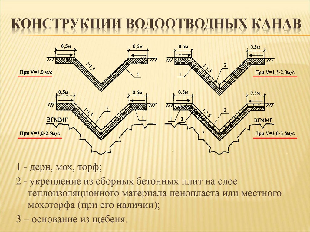 - на щебне и скальной почве используется трапециевидная и треугольная форма водостоков, но откос делается пологий — 1:1.