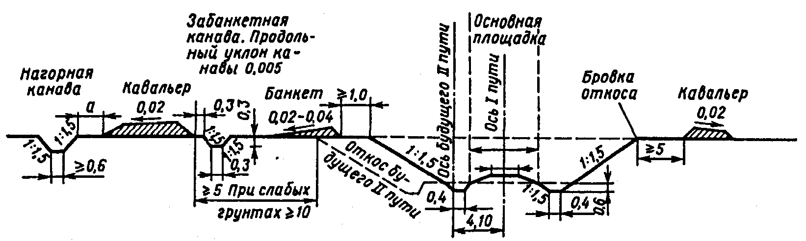 - Продольный внутренний угол дна траншеи зависит от категории магистрали, состояния почвы, климатических условий и выполняется с уклоном 3-5‰. При невозможности соблюдения нормативных требований проблема разрешается с помощью водобойных колодцев, испарительных бассейнов, и перепадов. При незначительной высоте насыпи (менее 1.5 м ) кюветы проектируются по обе стороны шоссе. Ров в поперечном сечении имеет выпуклый профиль.