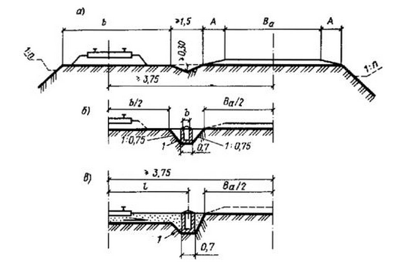 - в местах с сухим климатом — в виде треугольных сооружений. Глубина таких траншей не превышает 30 см, а угол откосы выбирается в пропорции 1:3 и более.