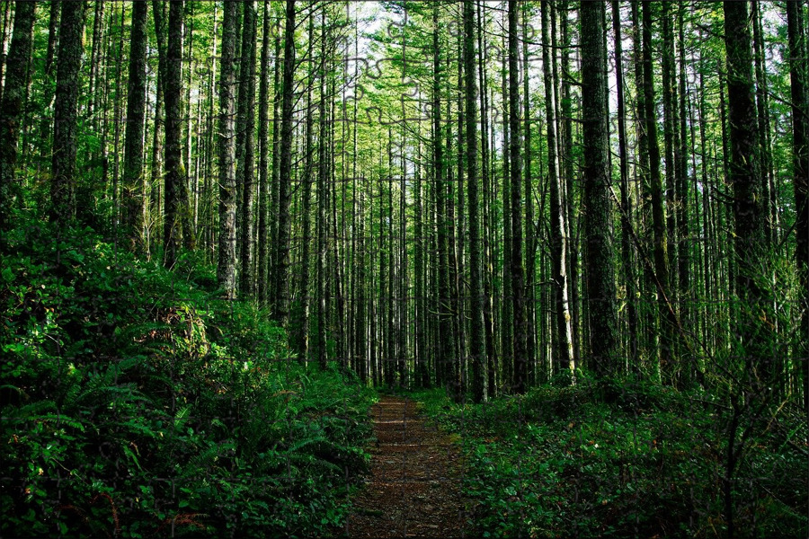 .Вид или сцена Природы. Маршрут через лесПан выстрелил в дорожку в лесу